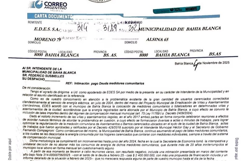 La intimación, escrita el 4 de noviembre y recibida en la intendencia al día siguiente, indica que en junio de 2024 la municipalidad dejó de pagar lo que le corresponde por un acuerdo que se firmó casi 20 años antes, en julio de 2004. En aquel momento, a raíz del crecimiento de los barrios carenciados en la ciudad, a través del Proyecto Municipal de Erradicación de Villas y Asentamientos Clandestinos, la compañía se comprometió a colocar en los mismos medidores comunitarios o totalizadores, y el gobierno bahiense a hacerse cargo del pago del consumo eléctrico.