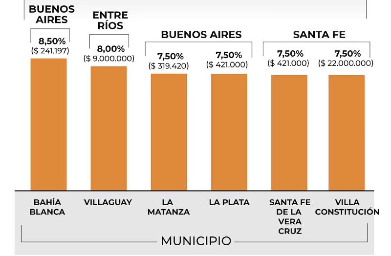 También hay otros dos municipios entrerrianos que cobran alícuotas con intervalos más altos que el resto: Concordia (1,3% a 2,7%) y Victoria (1,3% a 1,8%).