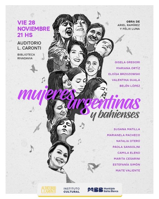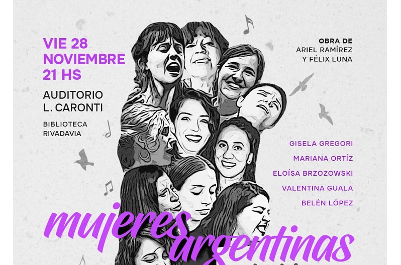 La obra musical Mujeres Argentinas, de Ariel Ramírez y Félix Luna, interpretada por 14 artistas de ese género de nuestra ciudad será el próximo Viernes 28 de noviembre, 21 hs. Auditorio de la Biblioteca Rivadavia.