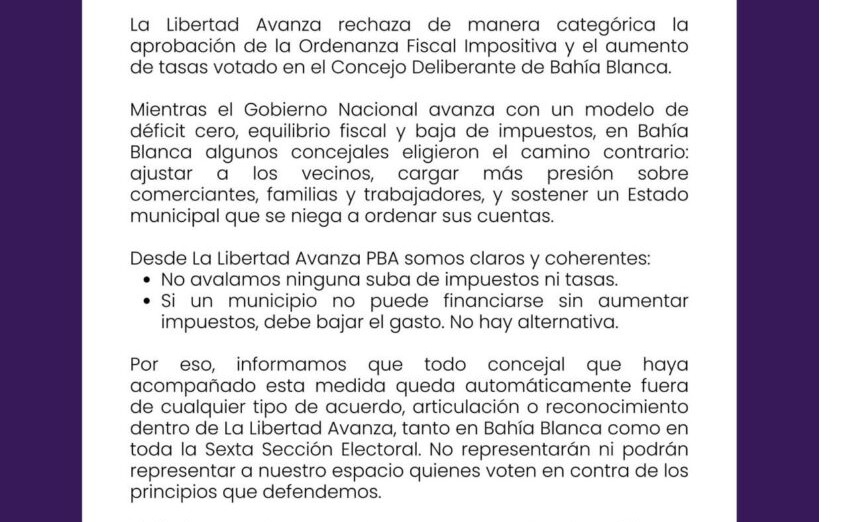 Horas más tarde, LLA difundió un comunicado oficial ampliando esa postura. La fuerza rechazó “de manera categórica” la aprobación de la ordenanza fiscal y la suba de tasas en Bahía Blanca, calificando la decisión como contraria al modelo de equilibrio fiscal impulsado por el Gobierno nacional. El documento remarcó que el espacio “no avala ninguna suba de impuestos ni tasas” y que los municipios deben ordenar el gasto antes que recurrir a incrementos que “ajustan a comerciantes, familias y trabajadores”.