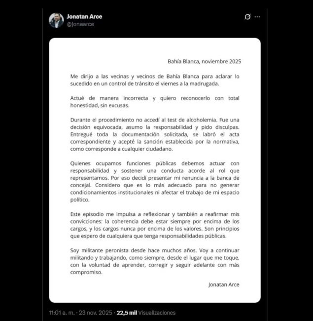 Ante lo ocurrido, el exconcejal reconoció que “actuó de manera incorrecta” y difundió una carta pública de arrepentimiento. “Quienes ocupamos funciones públicas debemos actuar con responsabilidad”, decía el mensaje, al explicar su renuncia. Durante el procedimiento no accedí al test de alcoholemia. Fue una decisión equivocada, asumo la responsabilidad y pido disculpas. Entregué toda la documentación solicitada, se labró el acta correspondiente y acepté la sanción establecida por la normativa, como corresponde a cualquier ciudadano” Y concluyó: “La coherencia debe estar siempre por encima de los cargos, y los cargos nunca por encima de los valores”.