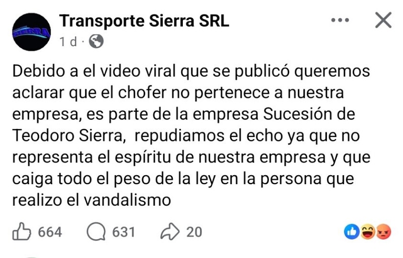 “Debido a el video viral que se publicó queremos aclarar que el chofer no pertenece a nuestra empresa, es parte de la empresa Sucesión de Teodoro Sierra, repudiamos el echo (SIC) ya que no representa el espíritu de nuestra empresa y que caiga todo el peso de la ley en la persona que realizo el vandalismo”.