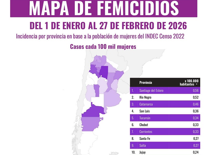 Las provincias con mayor tasa proporcional son Santiago del Estero (0,56 cada 100 mil mujeres), Río Negro (0,52) y Catamarca (0,46). Buenos Aires no figura entre las diez jurisdicciones con mayor incidencia.
