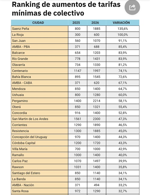 De acuerdo con los datos, Sáenz Peña encabeza el ranking de aumentos. En esa ciudad, el boleto pasó de $800 en enero 2025 a $1.885 en igual mes de 2026, lo que representa una suba del 135,6%. Detrás aparece La Rioja, donde la tarifa se duplicó: pasó de $300 a $600, con un incremento del 100%. En tercer lugar se ubica San Juan, con una suba del 91,1%, al pasar de $560 a $1.070