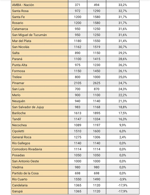 Así sigue la lista, con numerosas ciudades en el rango medio de aumentos, como se puede apreciar en la tabla. Entre las ciudades con menores incrementos se encuentran Bariloche, con una suba del 17,5%, Tandil, con 16,3%, y Necochea, con una suba del 9,9% en los últimos doce meses. Cipolletti registró una variación del 6%, mientras que General Roca mostró una suba marginal del 2,4%.